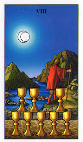 Dias atrás (4 meses) jogando Tarot para uma partilhante saiu o 8 de copas na casa 8. Falei, falei, falei e era num dos poucos momentos de interação, até ali. E ela me disse: “Sim! Estou com vontade de sumir. Tenho vontade de sumir!” A expressão dela é uma ótima definição para o 8 de copas, especialmente naquela situação e no contexto do jogo. O que pode assinalar um momento de transição, de equilíbrio em seguida, mas em alguns momentos… sumir parece ser o mais oportuno e rápido.