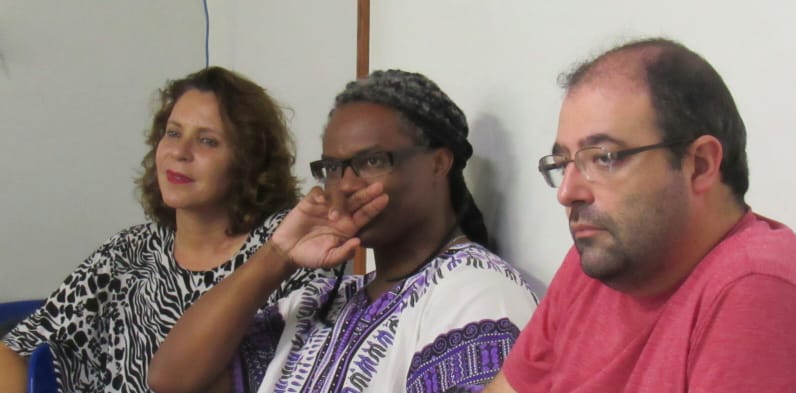 Claro que eu sabia que era uma pegadinha. Tinha muitas pessoas por lá. Minha fala seria no 3º dia com a Isabel. Estava despreocupado. Tivesse praia, eu tinha ido. Desculpa, tem praia sim, em SJDR, mas eu não fui. Chegando lá abraços, risadas, encontros, reencontros de pessoas e em pessoas que nunca vimos. Acho Márcio e ele está com Ana Cristina. Eu vi que tinha tido mesmo uma conjuração e eu ia mesmo fazer a abertura ao lado de Francisca. Uma mulher bela, com aquele sotaque cearense que vai fazendo a gente procurar rede. Aquela inteligência verbal rápida como a dos paulistas indo ao trabalho. Mas, uma doçura que vou chamar de mineira. Uma doçura de rapadura apimentada. Quando nos vimos pela 2ª vez, ela me disse assim: “ TUDO JÁ ESTÁ PREPARADO MUITO ANTES DA GENTE CHEGAR!!” Ela já sabia. Ela tinha desenhado essa trama com Marta. Tudo já estava parcialmente escrito. Fomos só dando a entoação. Foi mágico e torço para aqueles que não tiveram a felicidade de estar lá conosco, possa absorver o máximo possível nesse resumo. Deixem as suas impressões, seus comentários. Não foi possível registrar todas as falas, citar e mencionar todas as intervenções dos amigos presentes. Pelas fotografias de Cidinha tentamos inserir a maioria de nós.